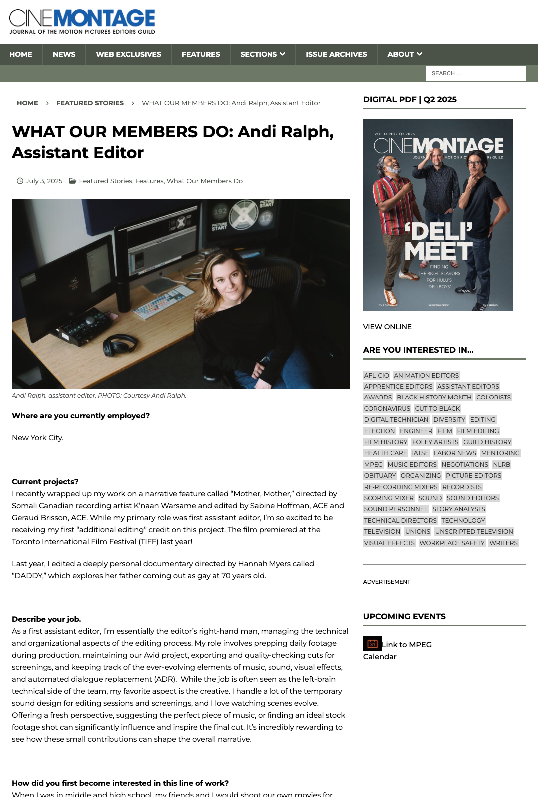 WHAT OUR MEMBERS DO: Andi Ralph, Assistant Editor Link to CineMontage Article Interview date: August 2024Published: June 2025